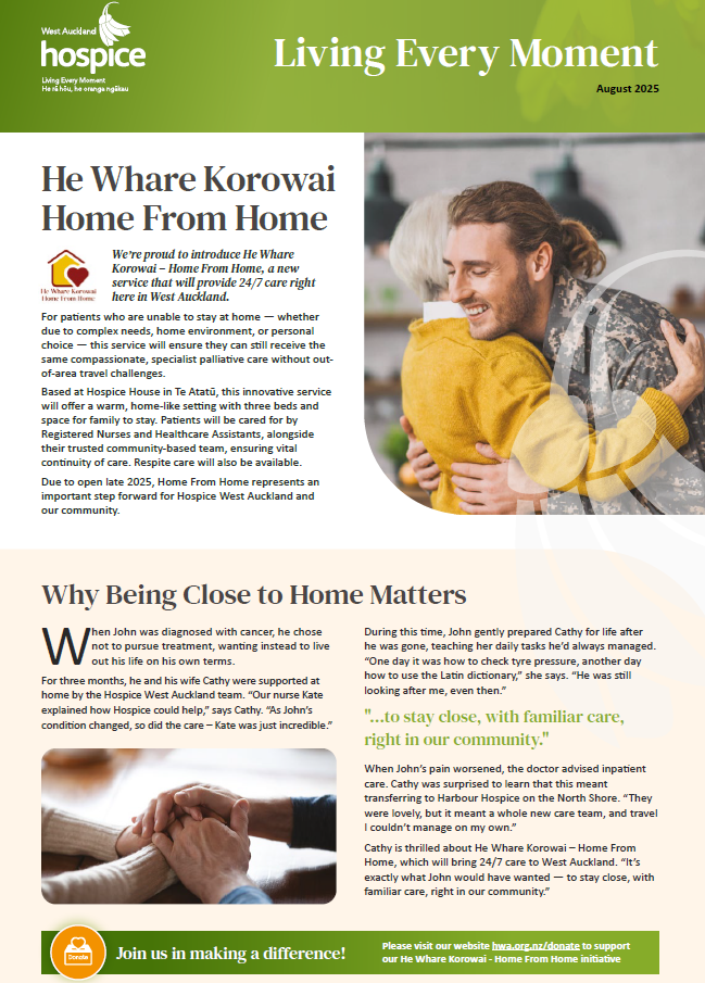 - Hospice West Auckland podcast series Angela’s Story – Walking the Final Path Together